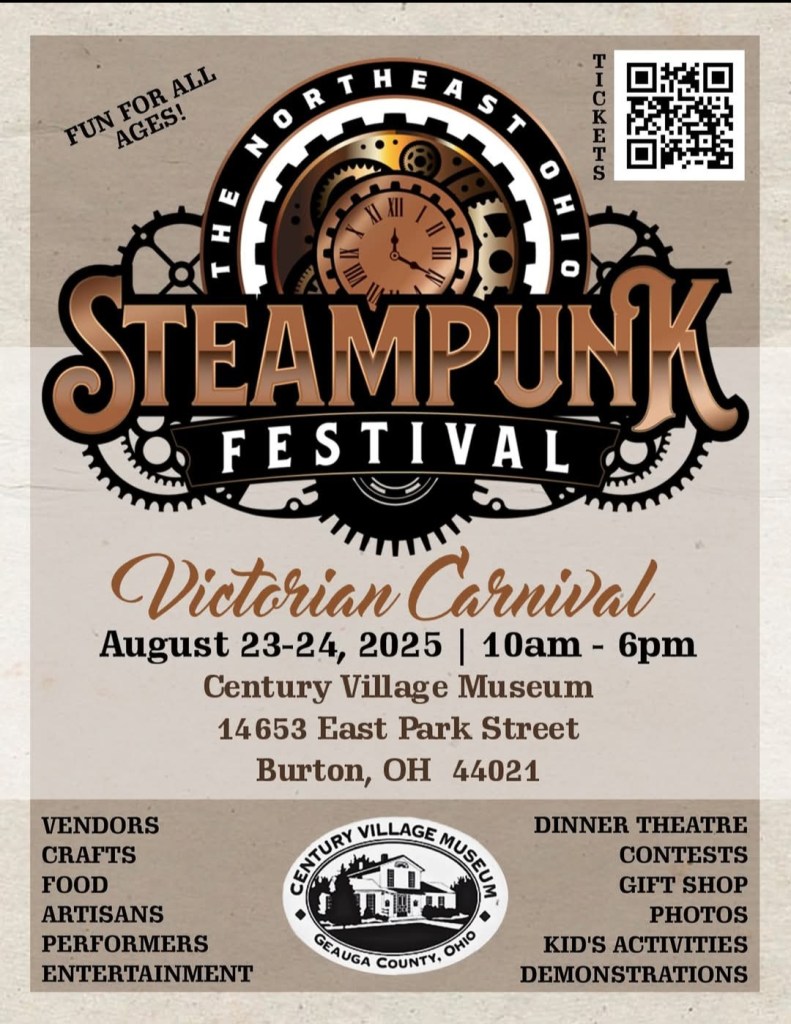 The Northeast Ohio Steampunk Festival will be held August 23th and 24th, 2025 at the Century Village Museum in Burton, Ohio. Each day will open at 10am and close at 6pm. Enjoy time shopping with each vendor and artisan, watch the shows and musical entertainment. Be part of the contests, such as The Moustache Contest, Costume Contest, and Tea Dueling Contest and dine with our food vendors.